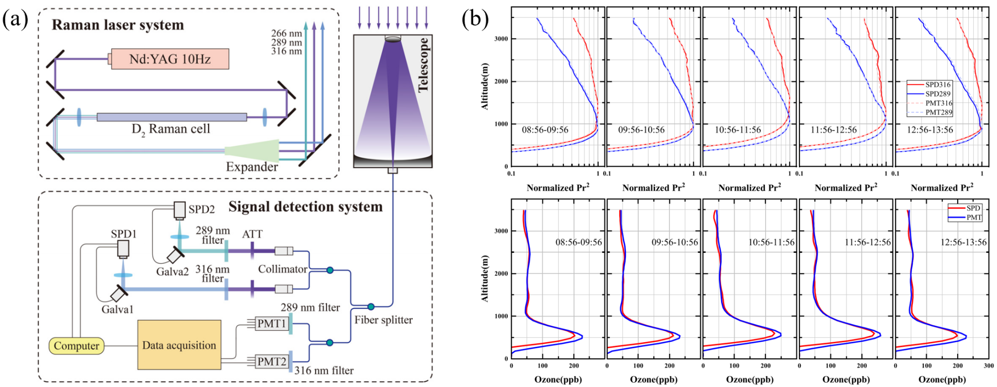 图2.单光子差分吸收臭氧激光雷达系统。(a)原理图;(b)臭氧浓度连续观测结果