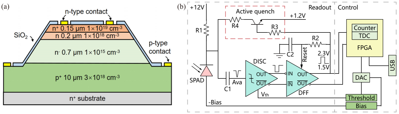 图1. (a)4H-SiC单光子雪崩光电二极管结构;(b)主动淬灭主动恢复读出电路