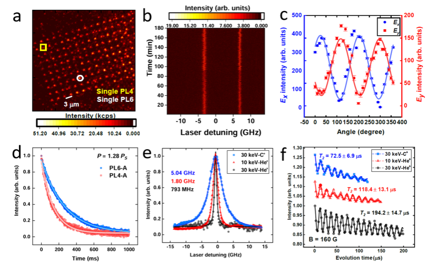 实验结果。图a单个双空位色心阵列的共聚焦荧光扫描图;b单个PL6色心在3小时内的时间分辨光致发光激发谱;c单个PL6色心的角分辨共振激发谱;d单个PL4和PL6的在相同激发功率下光电离速率的比较;e不同制备方法得到单个PL6的共振激发谱线宽;f不同制备方法得到单个PL6的自旋相干时间。