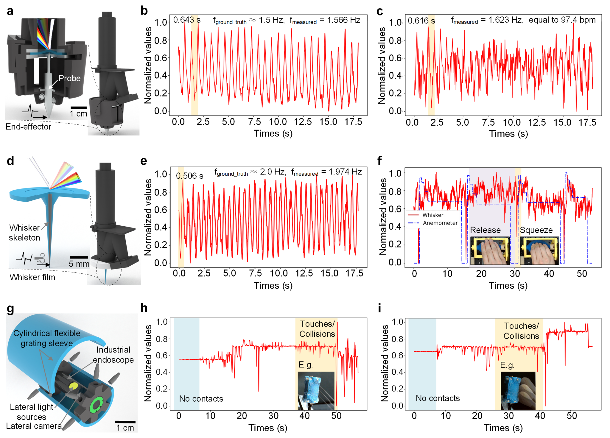 此外,基于柔性光栅结构色的触觉感知方法展现了卓越的可拓展适用性。研究团队基于核心组件的模块化设计,进一步开发了面向三种典型场景应用的传感器原型:一款高灵敏度振动传感器,能够精准检测低频振动信号;一款仿生触须传感器,能够灵敏感知低频振动和气流扰动;以及一套具备环向三维接触感知能力的内窥镜触觉传感系统。实验进一步验证了该触觉感知方法在机器人感知、环境监测和医疗器械等领域的广泛应用潜力,为智能感知技术的发展提供了全新的研究思路和技术途径。