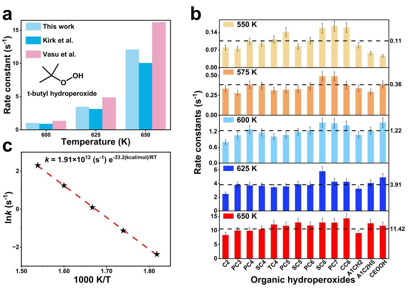 王占东教授课题组在国家同步辐射实验室原子与分子物理线站(BL09U)搭建了毛细管喷雾进样-射流搅拌反应器-超声分子束取样-同步辐射光电离质谱实验平台,实现过氧化物的低温高效气化,均匀温度场的分解反应,以及反应过程的实时在线测量。通过前期工作发展的过氧化物合成方法[Proc.Natl.Acad.Sci.120,e2220131120(2023)],制备出14种不同结构、不同官能团的烷基过氧化物以及一种典型的羰基过氧化物。基于上述实验平台,获得了这些过氧化物的分解曲线,计算出不同温度下的分解速率常数(图1)。实验结果表明,过氧化物的结构以及官能团变化对烷基过氧化物和羰基过氧化物的分解速率常数影响很小,解决了文献中过氧化物分解速率常数存在巨大差异的问题。