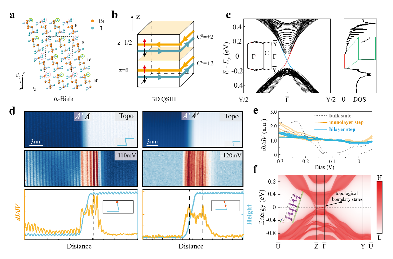 图.三维量子自旋霍尔绝缘体α-Bi4I4中观察到的一维拓扑边界态。a,α-Bi4I4的原子结构;b,三维量子自旋霍尔绝缘体示意图;c,单层Bi4I4能带计算;d,单层台阶(左)及双层台阶(右)处边界态分布;e, 单层及双层台阶边界态微分电导谱;f,体态能带计算。
