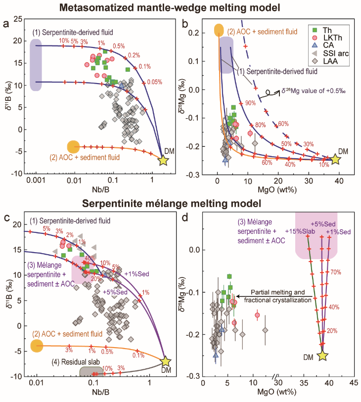图1、弧岩浆成因的Mg-B同位素组成的两端元混合模拟。(a-b)传统模型:亏损地幔与蛇纹岩衍生流体或板片地壳(沉积物+蚀变洋壳)衍生流体的混合;(c-d)新模型—蛇纹岩为主的混杂岩模型:亏损地幔与蛇纹岩为主的混杂岩+俯冲板片来源物质的混合。