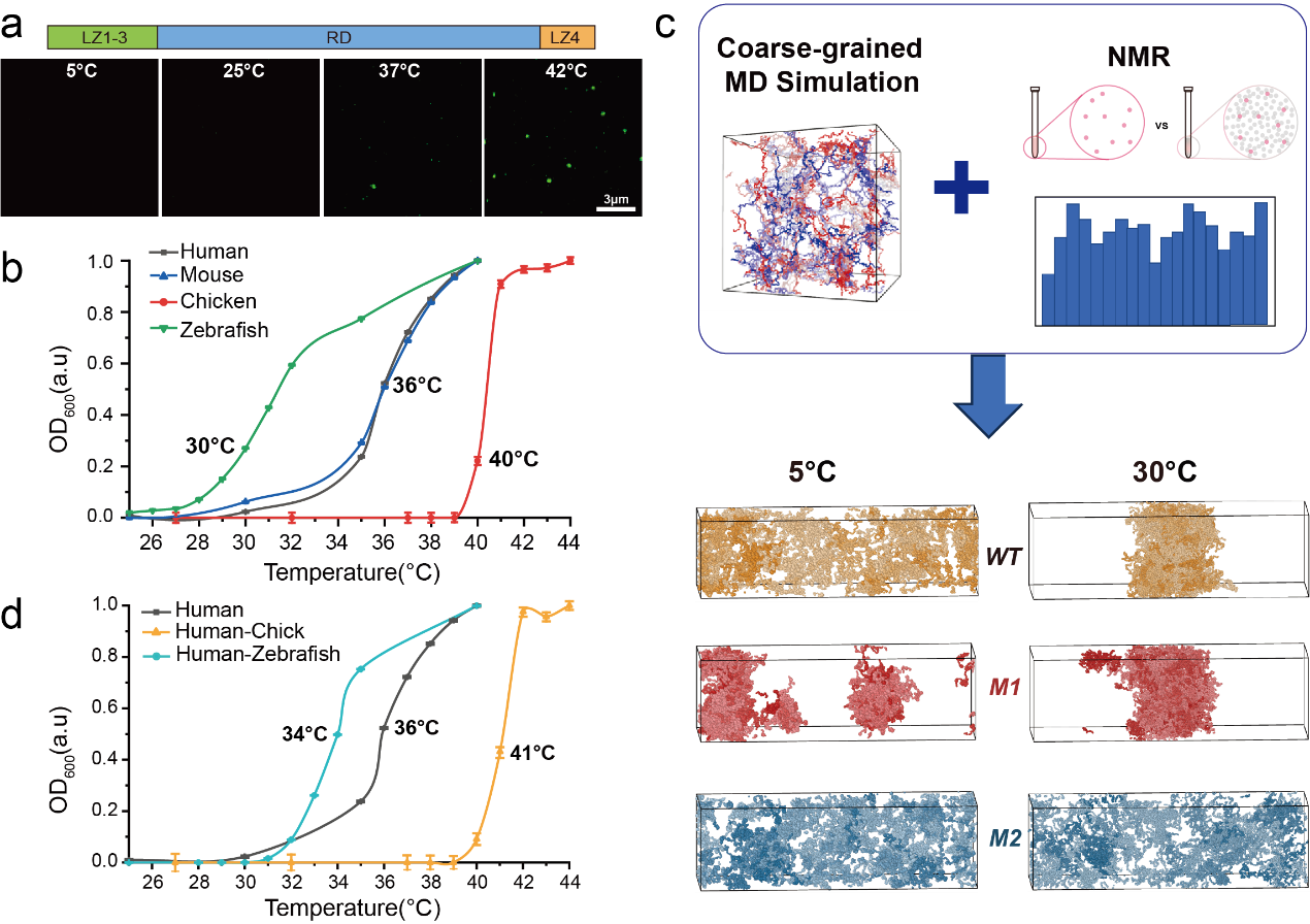 图1 a) HSF1有温度依赖性的相分离。b) 几个代表性物种的HSF1相变温度都在其生理体温附近。c)NMR互作数据驱动的粗粒化模拟方法,可以重现野生型及其模拟不同PTMs模式突变体的相分离现象。d) 交换不同物种HSF1的关键区域也改变了它们的相变温度。