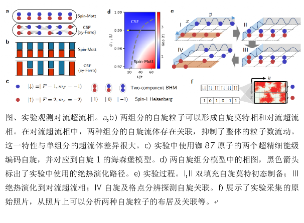 本世纪初,Kuklov等在理论上提出了对流超流的设想:与一般的超流体不同,对流超流相中存在两个相对流动的超流体,它们分别由自旋为A和B的粒子组成;两种自旋的粒子会相对流动,体现出超流性;但是两种相对流动的自旋流之间存在严格的关联使得总粒子流为零,因此整体上看并不存在流动性,而是形成莫特绝缘体。由于对流超流态的制备需要极低的温度,其观测更需要单原子自旋可分辨的测量能力,这些实验技术挑战使得此类超流性与绝缘性共存的新奇物态一直未被实验证实。