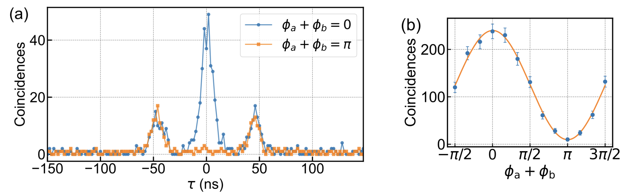 图2:非弹性散射过程中的能量-时间纠缠实验结果。(a)两光子间的时间分辨相关性测量。(b)双光子纠缠态的干涉曲线。