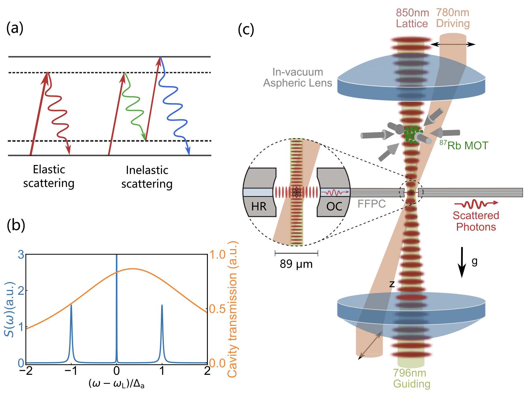 图1:实验原理与实验装置。(a)二能级原子的弹性散射和非弹性散射过程;(b)共振荧光谱线和光学腔增益谱线;(c)光纤微腔-中性原子系统实验装置。