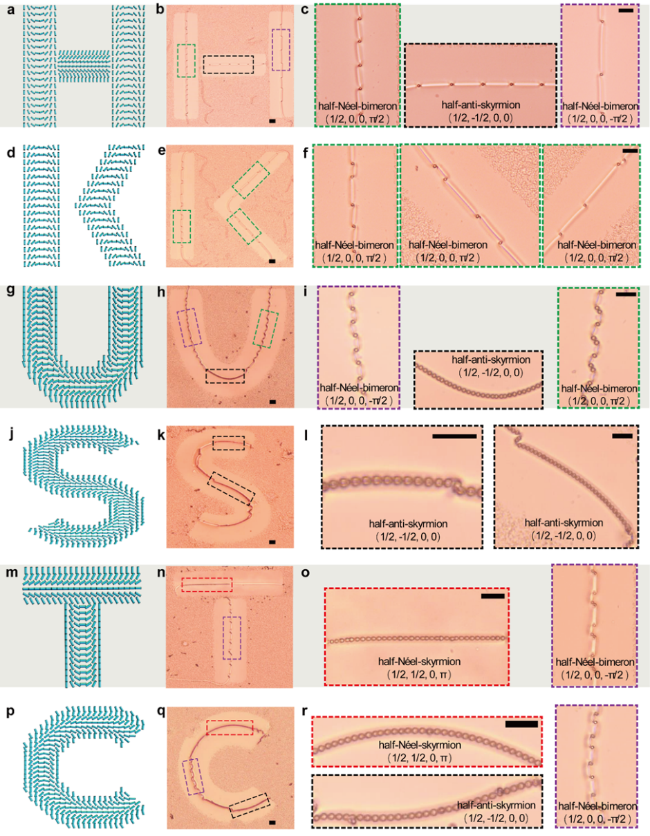 在这些前期工作的基础之上,合作团队发现当两种不兼容的拓扑模式间距超过一定距离时,一种新的具有周期性结构的拓扑物态呈现。结合理论模拟和实验验证,这种拓扑结构是一种三维的半斯格明子。这种半斯格明子可具有四种不同的拓扑结构,即半反斯格明子half-anti-skyrmion(HAS(-1/2,π))和半尼尔斯格明子half-Néel-skyrmion(HNS(-1/2,0))和两种半尼尔双半子half-Néel-bimeron(HNB(-1/2,π/2)和HNB(-1/2,-π/2))。当三维斯格明子在光驱动下处于非平衡状态时,其拓扑结构按照HNB(-1/2,π/2)、HNS(-1/2,0)、HNB(-1/2,-π/2)、HAS(-1/2,π)和 HNB(-1/2,π/2)的顺序进行转换。将具有拓扑缺陷的胶体颗粒置于此斯格明子中时,胶体颗粒呈现出胶体偶极子形态,此偶极子结构在运动的三维的斯格明子中旋转、被排斥和被吸引。当胶体自组装结构在此斯格明子中时,则呈现kink, coil及旋转等不同的自组装形态。具体来说,由于斯格明子中拓扑结构的转变,诱导胶体自组装结构的可控转换。合作团队还制备了具有环状结构的斯格明子环,此斯格明子环可在光驱动下进行扩张和收缩,胶体颗粒可绕着斯格明子环进行转动,最终形成jamming结构防止斯格明子的湮灭。最终合作团队制备了具有“HKUSTC”字样的任意形状的斯格明子结构,胶体颗粒在其中形成线状和zigzag结构的胶体自组装结构。