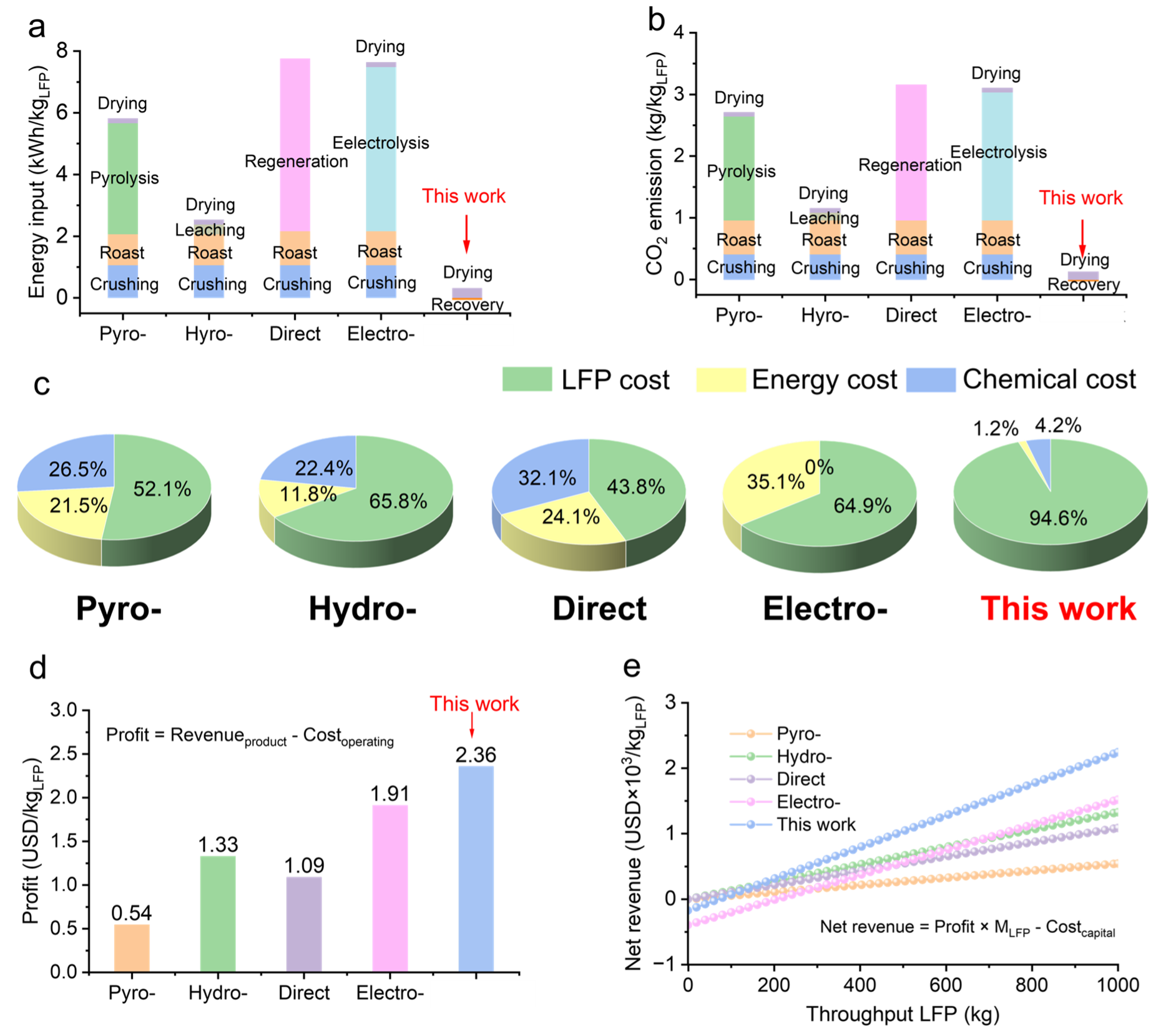 作者分析了所提出的回收策略与传统回收策略在经济和环保等方面的优劣势。针对电池回收工艺中各个主要回收步骤的能耗、二氧化碳排放以及成本收益进行系统性的核算后显示,所提出的回收工艺在能耗和二氧化碳排放量上远远低于目前主流的回收策略,表明该策略在绿色可持续经济上具有绝对的领先优势。对成本收益计算结果分析,表明所提出的策略也是优于其它四种传统回收策略。