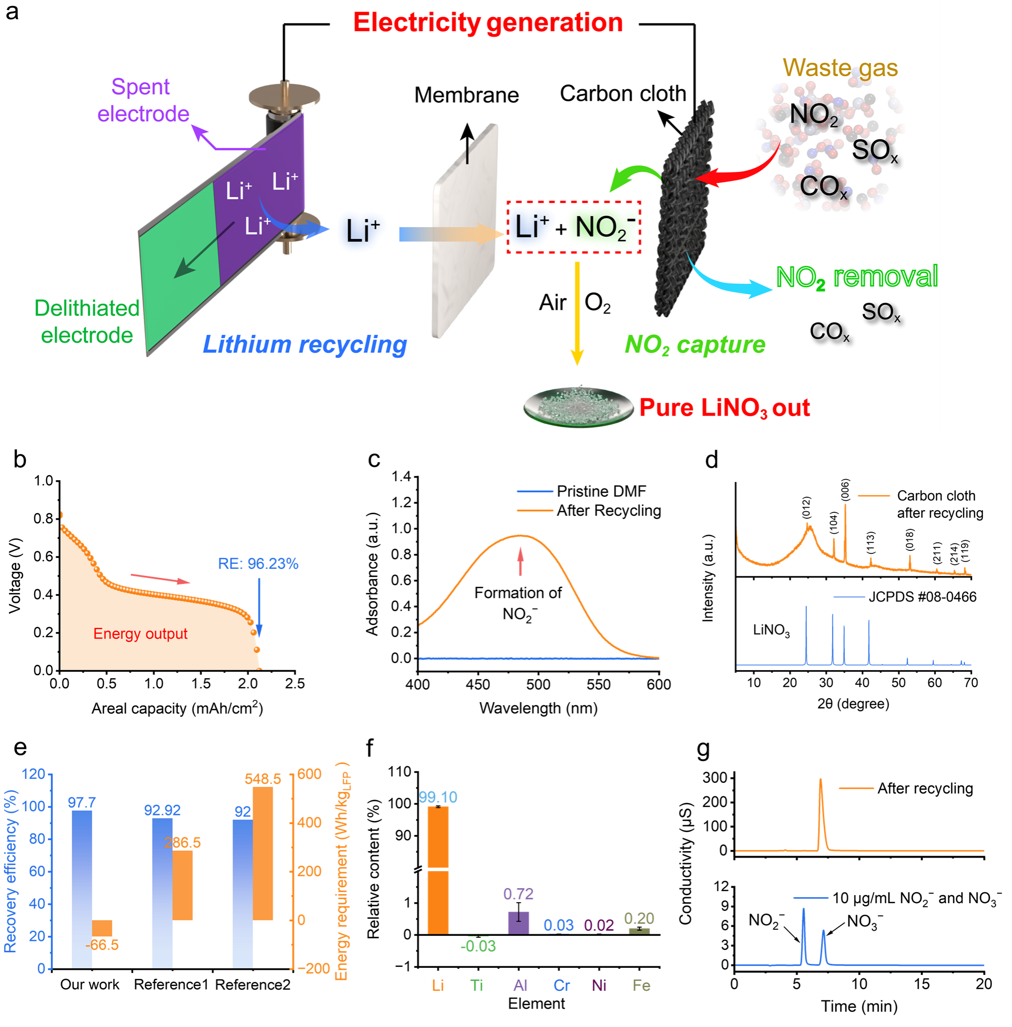 具体而言,锂离子将自发地从废旧锂电池正极材料中脱出进入电解液中而另一侧的二氧化氮则会被还原为亚硝酸根,两者结合形成的亚硝酸锂为直接的电化学反应产物,同时产生大约0.4 V的输出电压。电化学反应产物亚硝酸锂则会被空气中的氧气进一步氧化成为更加稳定的硝酸锂产物。