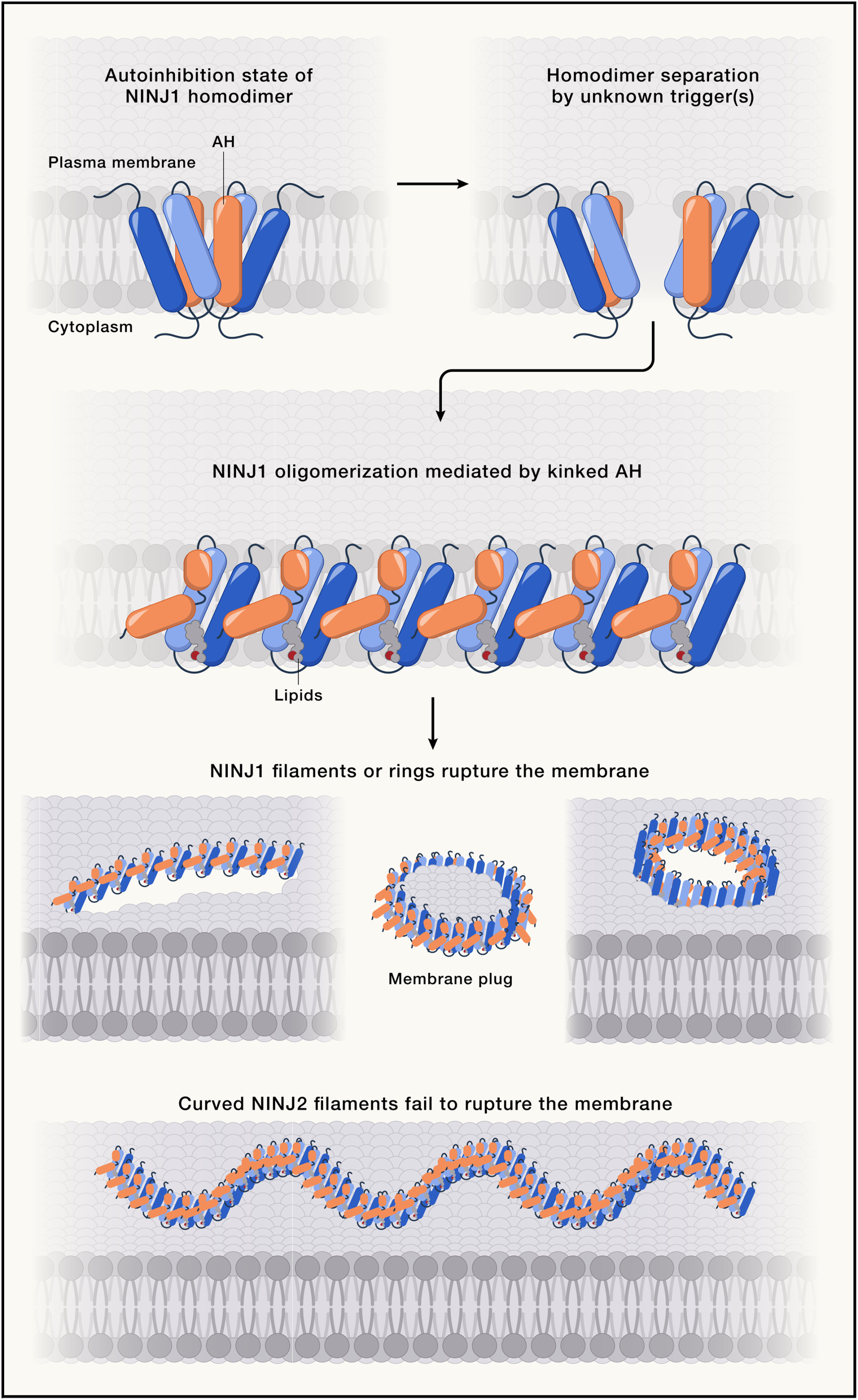 图1 : NINJ1 蛋白如何裂解细胞质膜。 NINJ1 蛋白介导裂解性细胞死亡的细胞质膜的裂解和溶解, NINJ1 蛋白在静息态时是自我抑制的二聚体,将疏水性表面包埋于二聚体界面。细胞膜的胀大可能触发 NINJ1 蛋白二聚体的分离和构象变化,从而聚集组装成纤维和环状结构,进而裂解和溶解细胞质膜,但弯曲状的 NINJ 2纤维难以在质膜平面形成长纤维来裂解质膜。