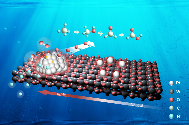 光驱动甲烷直接转化为甲酸是将甲烷转化为高附加值化学品并促进可持续发展的一种前景广阔的方法。然而,由于甲烷到甲酸涉及复杂的中间体,这一过程仍然具有挑战性。在此,他们设计了一种以铂(Pt)活性位点修饰的三氧化钨(WO3)基光催化剂,通过质子耦合电子转移过程促进氧活化,产生更多的活性氧物种,实现高效的甲烷到甲酸的转变。通过比较Pt单原子(SAs)和纯的WO3,他们发现负载Pt纳米颗粒(NPs)表现出更高的甲烷转化速率、甲酸产物的选择性。Pt纳米粒子可以促进氧气吸附和活化,通过可以促进光生载流子分离,从而实现O2解离;另外通过提高溶液中的质子浓度,提供足够的质子,从而降低羟基自由基(·OH)形成势垒,最终通过质子耦合电子转移过程促进·OH形成。在这个反应体制中,我们设计的PtNPs-WO3催化剂,可以实现 17.7 mmol g?1的HCOOH 产率,其HCOOH产物的选择性为 84%,并表现出优异的催化剂稳定性。这项研究为甲烷转化催化剂设计和反应机理提供了新的思路。