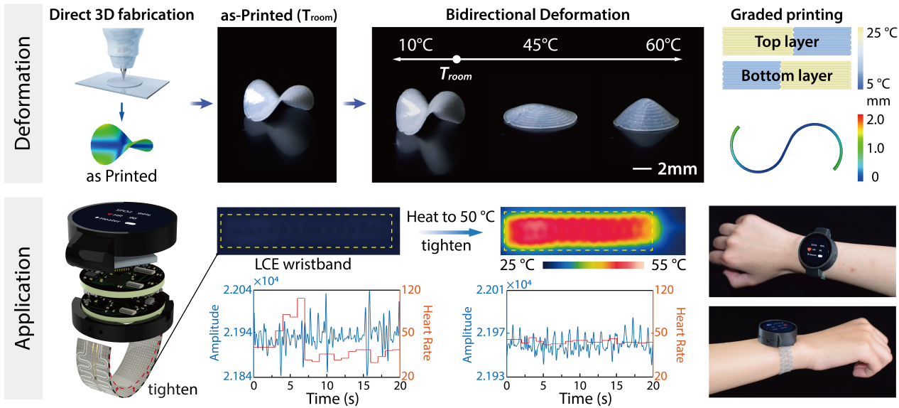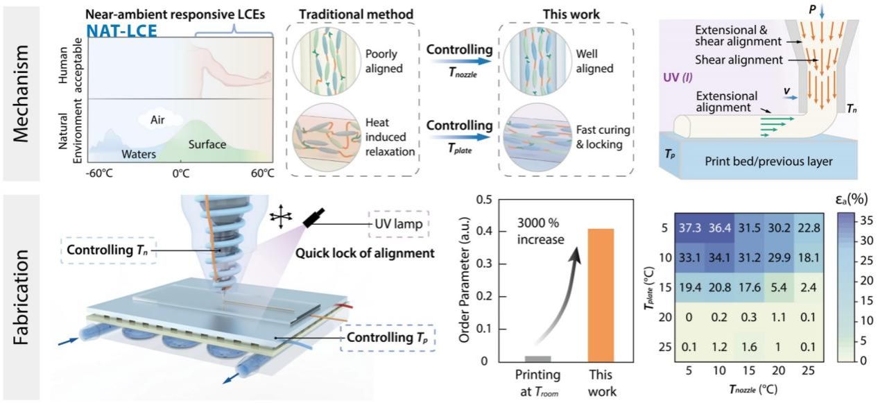 近日,中国科学技术大学工程科学学院、人形机器人研究院的李木军副教授,联合张世武教授等研究人员,在智能材料3D打印领域取得重要进展。研究团队提出复合冷场3D打印技术,成功制备具有高取向序参数和多元形变能力的近环境温度响应液晶弹性体(NAT-LCEs),并基于此开发出心率监测精度显著提升的智能腕带系统。成果以“3D Printing of Near-Ambient Responsive Liquid Crystal Elastomers with Enhanced Nematic Order and Pluralized Transformation”为题发表于期刊《美国化学学会纳米杂志》(ACS Nano)上。