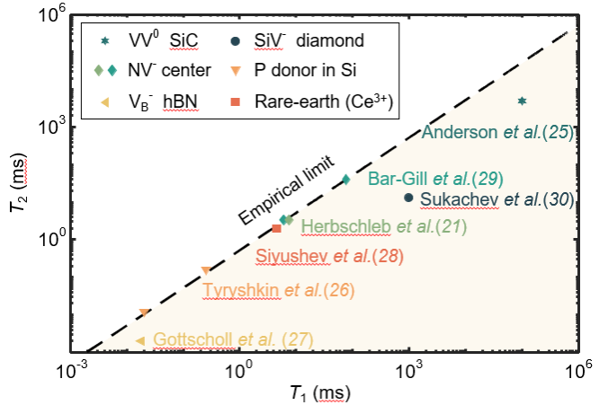 图1:各固态自旋体系相干时间服从T2= T1/2经验极限,其中T2表示自旋量子体系的相干时间,T1表示自旋量子体系的弛豫时间。引用参考文献见链接正文。