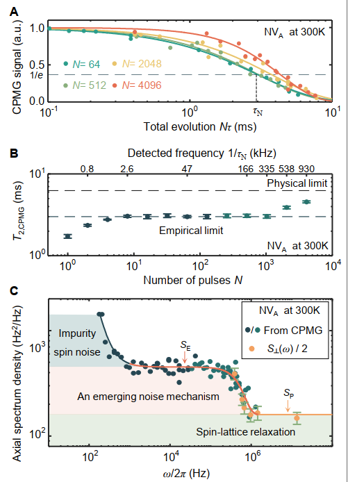 图3:相干时间超越经验极限。(A)不同阶动力学解耦曲线。(B)相干时间随不同动力学解耦阶数的变化,其中平台区域为通常所观测到的经验极限,由(C)中所显示的SE噪声平台区域所导致。当解耦频率超过该平台频率范围后,相干时间逐步接近由热耗散导致的2T1物理极限。(C)相干丢失的完整噪声谱刻画,由自旋-自旋噪声(低频区:<1KHz)、传统自旋晶格弛豫(高频区:>1MHz)以及新发现的非局域自旋-晶格噪声(1KHz-1MHz)共同主导。