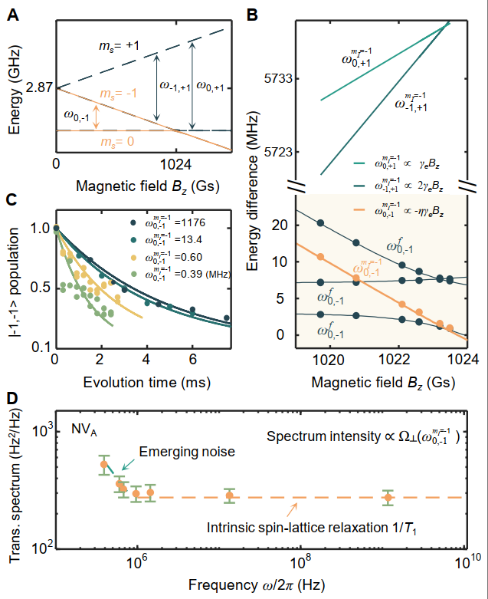 图2:弛豫谱探测技术发现新噪声机制。(A)金刚石NV色心能级示意图。(B)MHz-GHz的宽频谱弛豫探测技术。(C)自旋态弛豫曲线。(D)弛豫谱构建揭示在低于1MHz频谱范围内的新噪声。