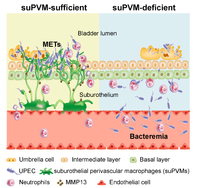 败血症是造成人类死亡的第一重症,占全球年度总死亡人数约20%,其中近四分之一败血症患者由尿路感染所致。尿路感染主要发生于膀胱,每年患者约1.5亿人,是最常见的细菌感染性疾病之一。有效限制尿路病原菌从膀胱局部侵袭血液进而扩散至全身,对于防止败血症发生至关重要。2月27日,中国科学技术大学生命科学与医学部、免疫应答与免疫治疗全国重点实验室曾筑天课题组在《Immunity》在线发表题为“A bladder-blood immune barrier constituted by suburothelial perivascular macrophages restrains uropathogen dissemination”的研究论文,发现并命名了膀胱驻留性巨噬细胞新群体—suPVM,揭示了suPVMs通过释放巨噬细胞胞外诱捕网(METs)阻隔尿路病原菌血行扩散的关键性血-膀免疫屏障功能和分子机制。该研究将有助于对尿源性败血症病理机制的理解和防治策略开发。