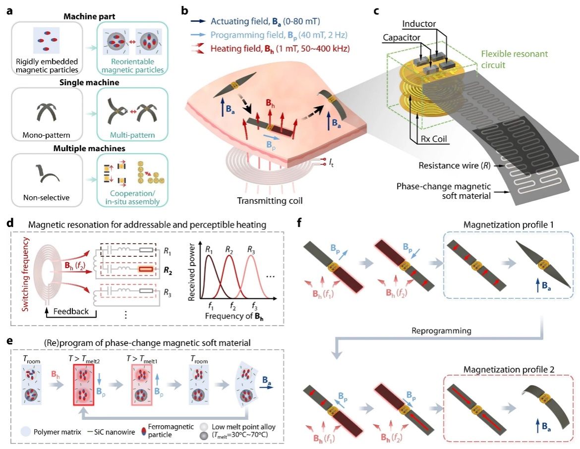 磁控软体机器人因其无线可控性、多功能性和生物安全性,在生物医学中得到广泛应用。但传统磁性软体机器人依赖固定磁化模式,其功能与适应性受限于单一预设形态,同时由于全局磁场的存在,如何实现多机系统间选择性驱动和共同协作也一直是磁控软体机器人应用的关键问题。针对上述问题,研究团队提出了一种多磁场协同作用的控制策略。通过柔性谐振电路设计,利用高频磁场(50-400 kHz)选择性加热机器人特定区域,可实时感知能量传输状态。同时,采用低温相变磁性复合材料,并利用脉冲磁场打破磁颗粒间作用力,在40 mT低编程磁场下即可通过固-液相变实现磁化方向快速重构,磁化强度较传统方法提升104%。该控制策略在生物安全温度范围(30-70℃)内即可完成磁化重构,避免生物体高温灼伤。