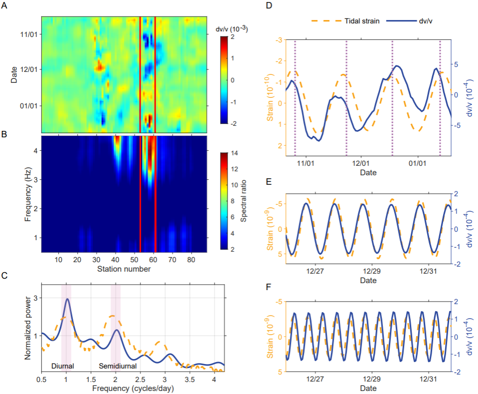图1.(A)日分辨率地震波速变化结果(B)远震体波标准谱比法结果,红线内部区域表示断层破碎带的位置。(C)波速变化频谱与潮汐应变频谱的比较。(D-F)不同周期的地震波速变化与潮汐应变的比较。