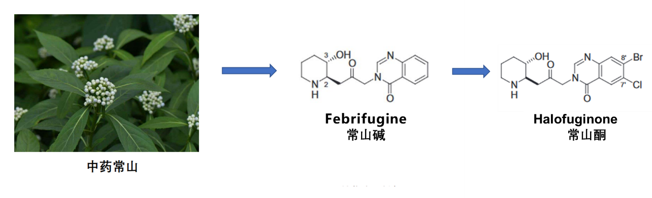 抗日战争期间,疟疾泛滥,急需替代药物。“中国特效药研究所”应需成立,老一辈科学家们把目光聚焦到传统抗疟中药常山(虎耳草科植物常山的根,学名Dichroa febrifuga Lour.,常山用于治疗疟疾引起的发热已有约2000年多年的历史),系统研究其抗疟作用。后续研究发现常山碱(febrifugine),一种存在于常山的根和叶中的喹唑啉酮类生物碱,是常山的主要抗疟活性成分。代表性的是张昌绍教授及其合作者赵承嘏教授团队利用现代科学方法,对常山碱的抗疟作用进行了系统研究,并通过实验验证其有效性,确立其作为抗疟药的潜力,这些研究先后发表于Science(1946)1,Nature(1948)2,Journal of the American Chemical Society(1948)3等期刊。这一系列来自我国科学家的研究阐明了常山抗疟的药效物质基础,也为后续抗疟药物的开发提供了范例。但是,由于常山碱存在恶心、呕吐等不良反应,其临床开发受阻。之后,常山碱的卤化衍生物,即常山酮被成功设计出来。与常山碱相比,常山酮的抗疟活性更强且副作用更小,这一优势使得常山酮被美国FDA批准用于动物用抗寄生虫药物,并在I期和II期临床试验中用于治疗艾滋病相关的卡波济肉瘤和实体肿瘤等(www.clinicaltrials.gov)。机制研究发现,常山酮通过激活氨基酸饥饿反应抑制Th17细胞分化以及白细胞介素-17分泌,其机制是通过抑制人类脯氨酰-tRNA合成酶(ProRS)导致细胞内未负载tRNA的积累(Science, 2009)4。之后的晶体结构研究分析发现:常山酮是一种新型ATP依赖性抑制剂,可同时占据ProRS上的两个不同底物结合位点(一个部分模拟结合状态的脯氨酸,另一部分则模拟结合tRNA的3'末端)(Nature, 2013)5。然而,作为氨基酸饥饿的模拟药物,常山酮是否可以用于肥胖及其并发症的治疗尚不完全清楚。