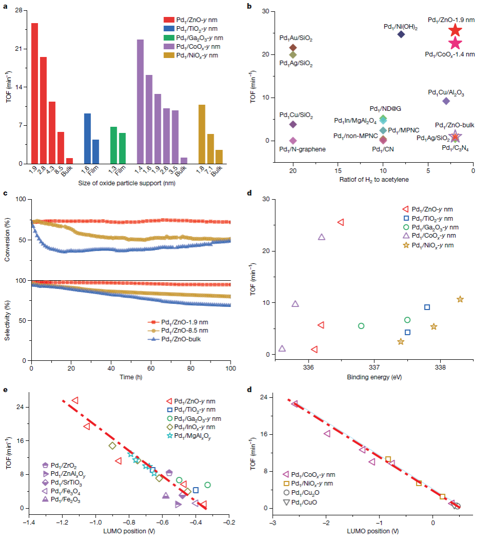 在乙炔选择性加氢反应中,研究发现当ZnO、CoO?等载体尺寸降至纳米级时,Pd SACs在保持高选择性的同时,其活性较传统块体氧化物负载的Pd SACs提升20倍以上,打破了活性与选择性间的“跷跷板”效应。其中,1.9 nm ZnO负载的Pd SACs在80°C下表现出25.6 min??的优异活性,远超文献报道的其他Pd SACs,且为Pd?Ag/SiO?单原子合金催化剂的活性的46倍。值得注意的是,该催化剂在100 h稳定性测试中未出现积碳或金属团聚现象,展现出了卓越的稳定性(图2),相反,传统的体相ZnO负载的PdSAC,则出现了催化选择性降低和金属严重聚集现象。进一步研究发现,同类型载体的Pd SACs活性与Pd价态呈线性相关,但不同种类载体的PdSACs的活性与价态并无直接关联。相反,研究表明,所测试的全部PdSACs的催化活性与实验上测得的载体LUMO能级位置呈线性关系。