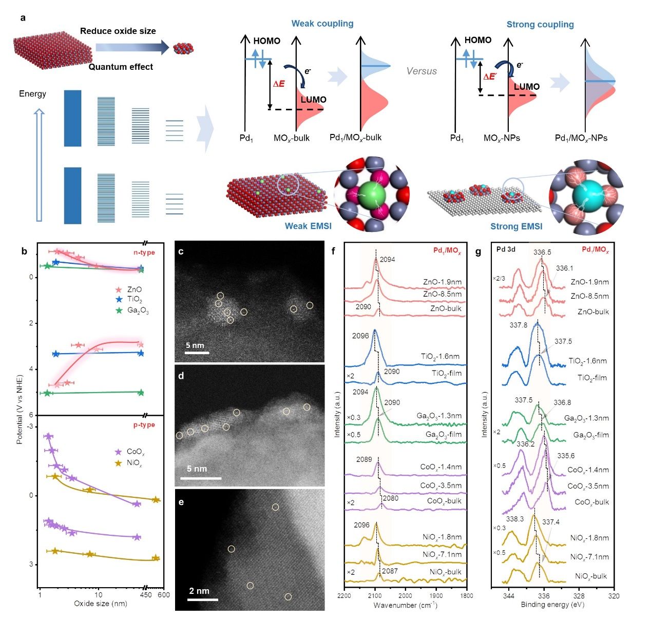 该工作中,路军岭教授研究团队在14种半导体载体表面构建了34种钯(Pd)单原子催化剂,通过调控载体种类与尺寸,实现了对载体最低未占分子轨道(LUMO)和最高占据分子轨道(HOMO)能级位置的精准调控。具体而言,团队首先利用原子层沉积(ALD)技术在SiO?基底上制备了不同尺寸的MO?(M=Zn、Co、Ni、Ga、Ti)氧化物颗粒。紫外可见吸收谱和Mott-Schottky 测试确定了上述氧化物的LUMO与HOMO能级位置随颗粒尺寸的演化。随后,团队进一步通过Pd ALD技术将Pd单原子选择性沉积于MO?颗粒表面,获得系列Pd?/MO? SACs。杨冰副研究员则利用球差校正扫描电镜确认了Pd单原子在MO?氧化物颗粒表面上的成核。原位漫反射红外CO吸附与原位X射线光电子能谱分析进一步表明,随着氧化物尺寸减小,CO吸附峰发生蓝移,Pd单原子价态逐渐升高,证实了Pd与MO?间电子相互作用的增强(图1)。