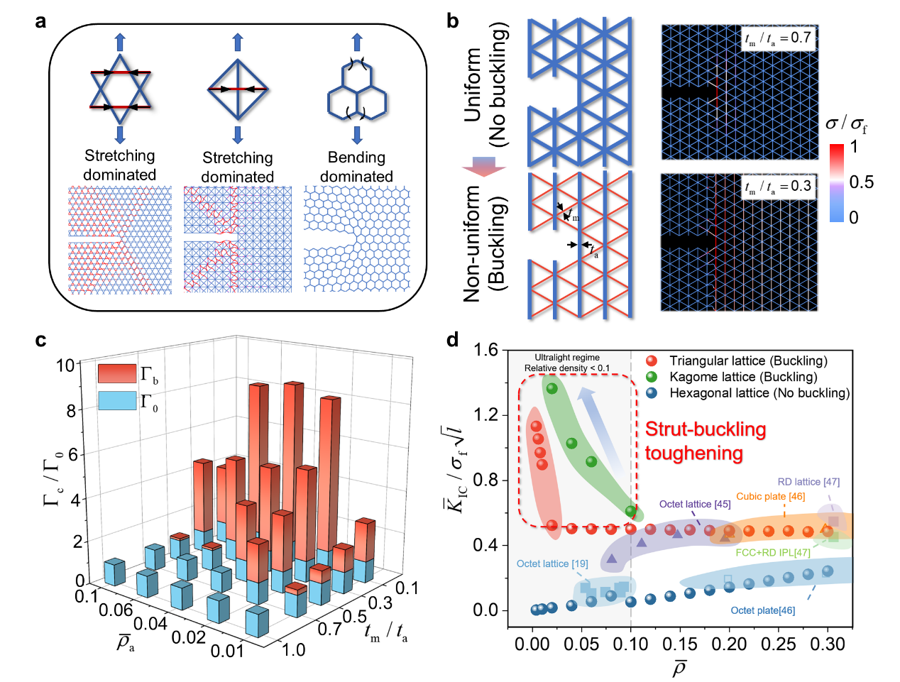 图2.点阵超材料中杆件屈曲引起断裂增韧的普遍机制与结构增韧设计