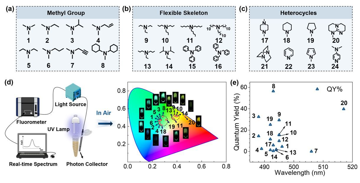 有机胺的识别和区分在药物分析、食品腐败、生物医学检测和临床诊断等领域的应用至关重要。现有的基于发光的胺识别方法主要依赖于荧光淬灭,这限制了灵敏性和选择性检测的范围(图1a, b)。最近,张国庆教授团队提出了一种荧光变色方法,用于快速区分不同的有机胺。在光照条件下,三级胺分子和被光激活的萘酰亚胺分子首先形成激基复合物(exciplex),并构象调整为稳定的光致电荷转移络合物(PCTC)。三级胺和萘酰亚胺分子在光照下的独特结合方式为高度类似的三级胺分子取代基结构的区分提供了条件(图1c)。