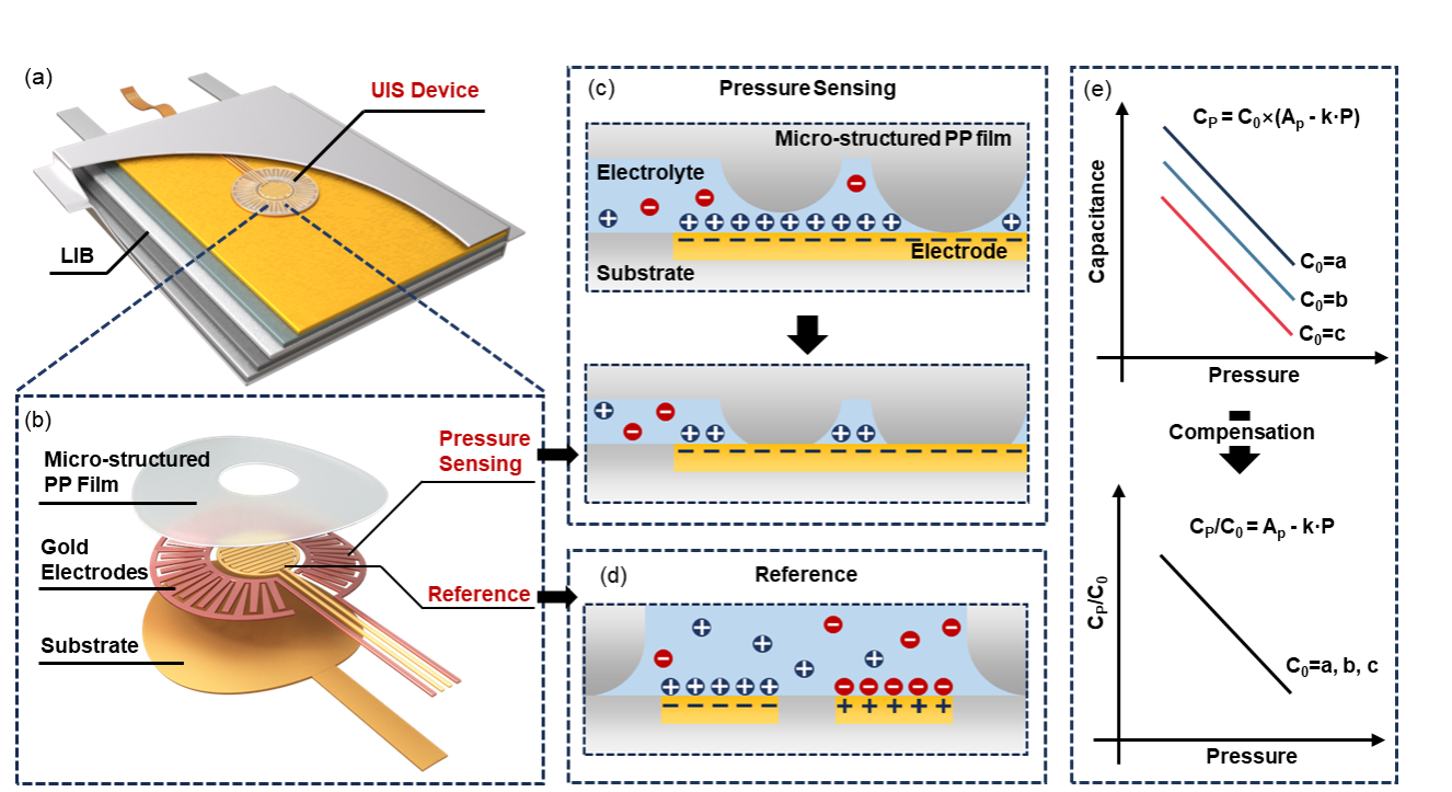 图:系统示意图 (a) 植入电池内的一体式离电传感技术;(b)一体式离电传感器结构图;(c)压力传感单元压力响应机理;(d)参比单元监测电解液离子电导性原理;(e)通过补偿算法消除环境因素对压力传感单元的干扰