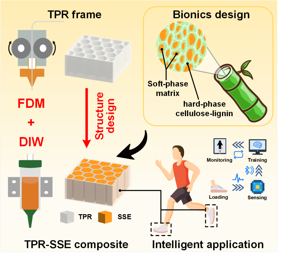 图1.基于混合式3D打印策略的仿生晶格结构软硬相TPR-SSE复合材料及其智能化应用