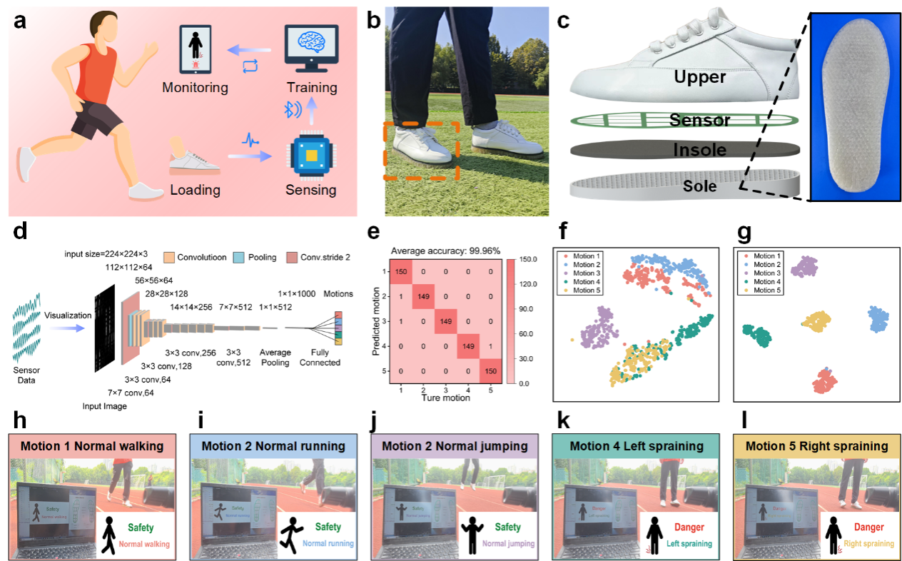 基于蜂窝晶格结构TPR-SSE复合材料优异的力学性能,研究团队充分发挥该混合式3D打印技术在结构可定制化方面的优势,进一步将复合材料与深度学习算法驱动的无线传感模块集成,成功开发出兼具实时步态传感、识别与个性化预警功能的新型智能运动鞋。该智能可穿戴设备在复杂载荷下展现出优异且稳定的力学响应与动态传感性能,充分验证了TPR-SSE复合材料在运动防护、智能健康监测等前沿应用领域中的广阔前景。