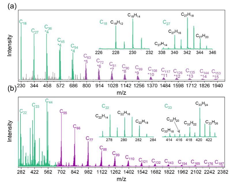 图1.黑碳气溶胶中测量到的不同分子量的共价团簇