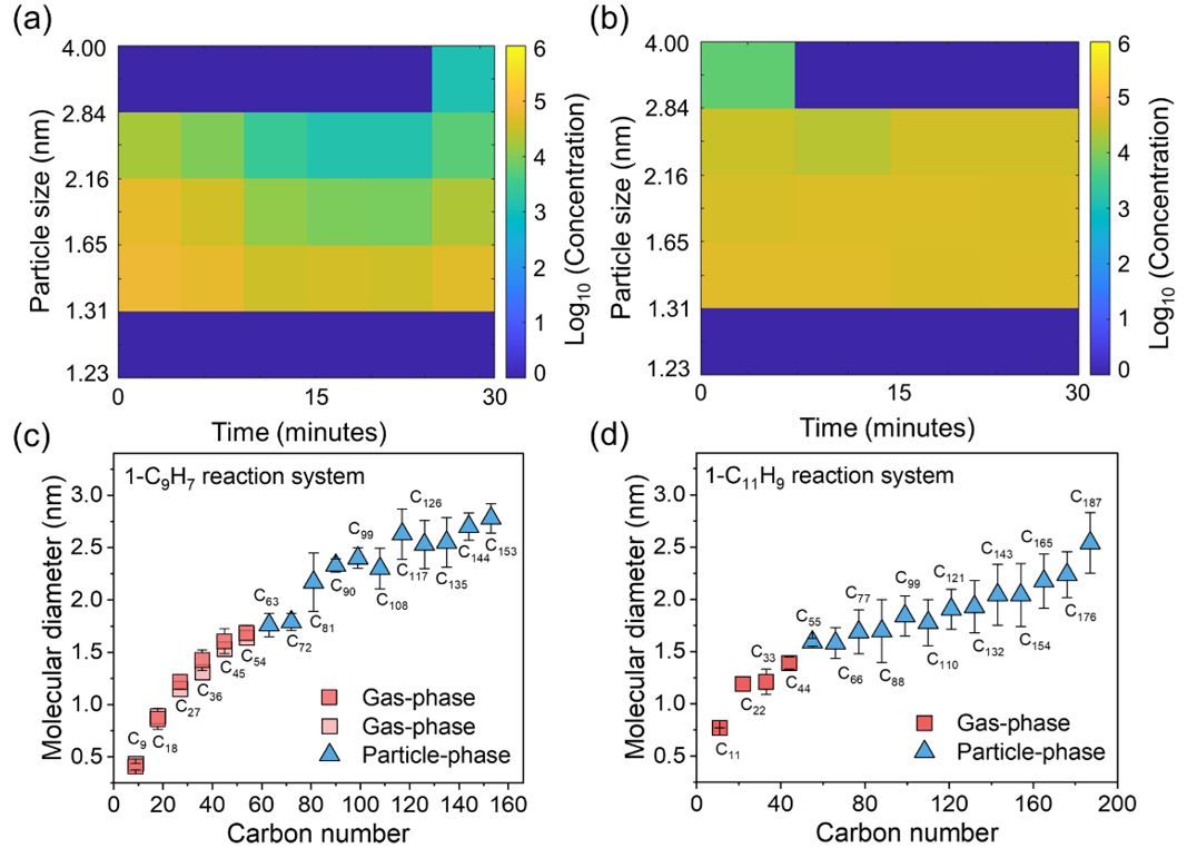 图2.(a)-(b)1-茚基、1-甲基萘基热解实验中探测到的黑碳气溶胶新粒子大小为1.3-1.6纳米;(c)-(d)理论计算和模拟不同结构共价团簇中间体的相变尺寸为1.5纳米附近,与实验值高度吻合。