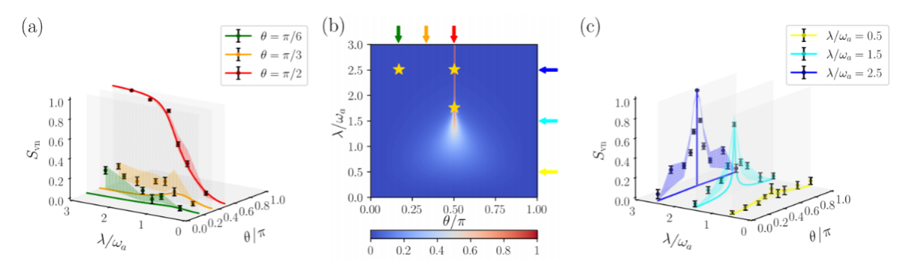图:自旋的冯·诺依曼熵随着对称性控制参数θ以及耦合强度λ的变化关系