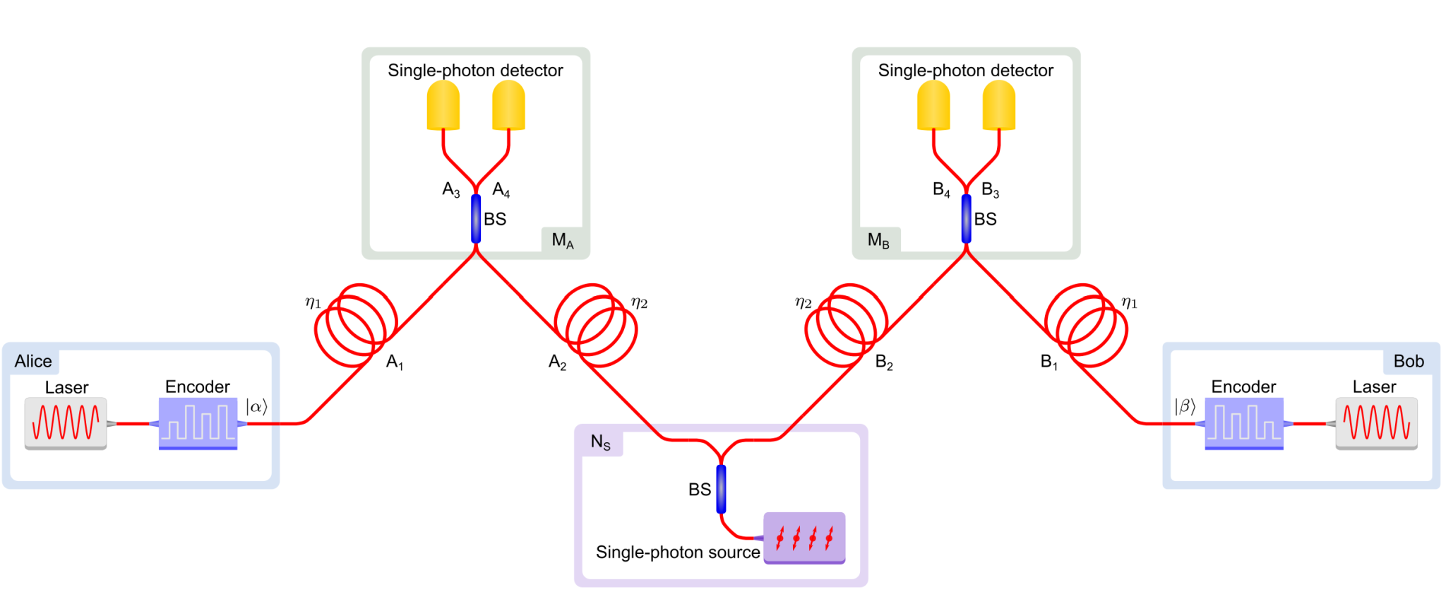 为验证该网络结构的功能,研究团队采用相位匹配量子密钥分发协议,在总长 300 公里的光纤链路中成功实现了密钥的安全分发。这一结果不仅证实了该架构在长距离量子通信场景中的可行性,也体现了单光子源作为量子中继核心单元的应用潜力,为未来构建覆盖范围更广、安全性更高、灵活性更强的量子网络奠定了基础。