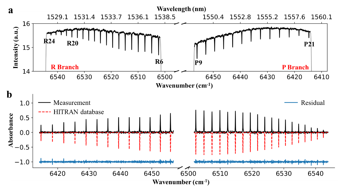 图1. 实验室验证光路抖动、飞瓦级总探测能量条件下的HCN双光梳光谱