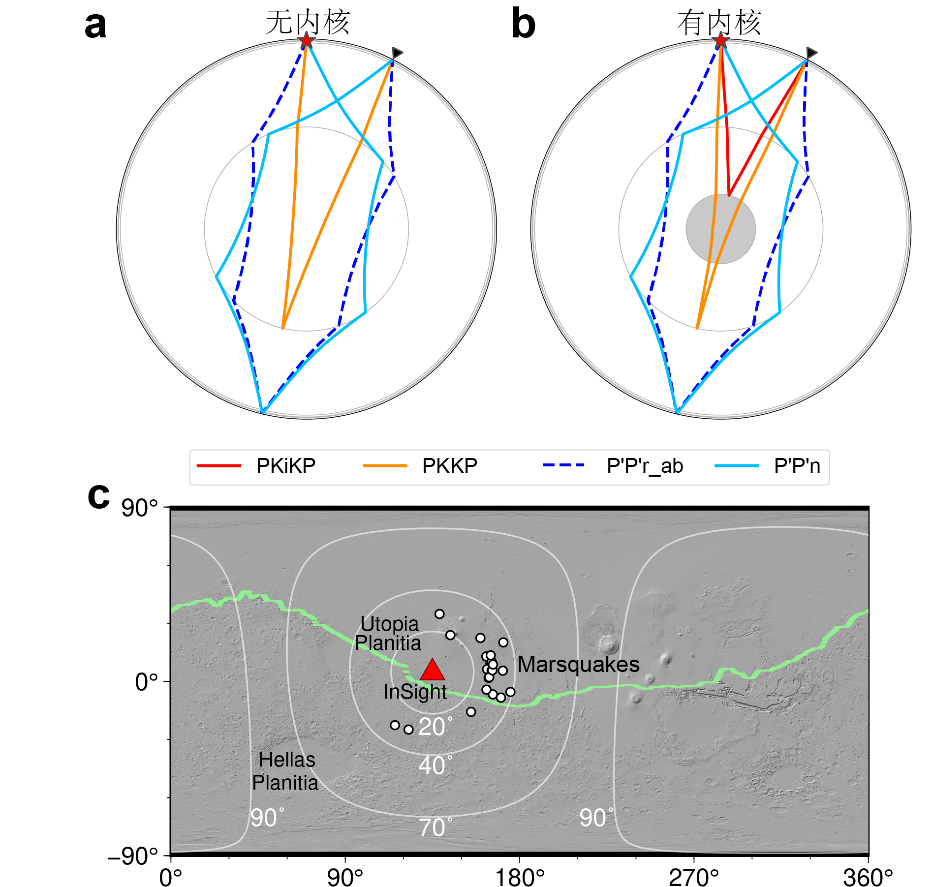 为突破这一挑战,研究团队创新性地引入火震阵列分析方法,通过对23个信噪比较高的火震事件数据的分析,成功提取出穿过火星核的关键震相,如在地表反射的PKPPKP(P'P')和在核幔边界反射的PKKP(图1a)。特别值得注意的是,实际观测到的PKKP到时,较当前仅考虑液态核的火星速度模型所预测的结果提前了50–200秒。这一差异表明,火星核具有分层结构:即外层为液态核,而更深部则存在一个波速更高的固态内核。