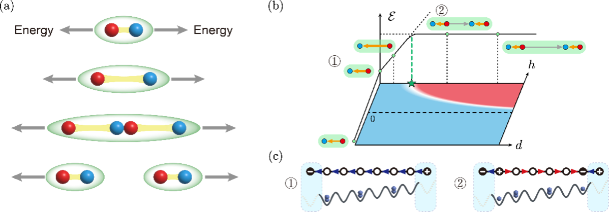 图注:(a)弦断裂现象示意图;(b)弦断裂过程中系统能量随着弦张力和电荷间距的变化关系;(c)量子链接模型和玻色-哈伯德模型中,弦态①和断裂弦态②的构型。