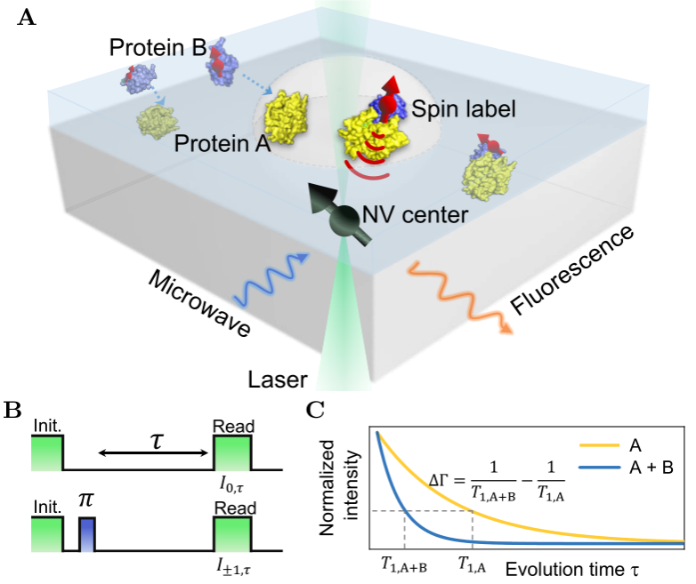 图2.基于量子弛豫技术的分子相互作用检测。(A)实验原理:蛋白A修饰于金刚石表面,距离NV色心~10 nm,溶液中的蛋白分子B带有金属离子自旋标记。AB两种分子结合后,NV色心感应到B分子上自旋标记产生的磁噪声,量子弛豫加速。(B)NV色心量子弛豫测量序列。(C)蛋白AB结合前后NV色心的量子弛豫曲线。