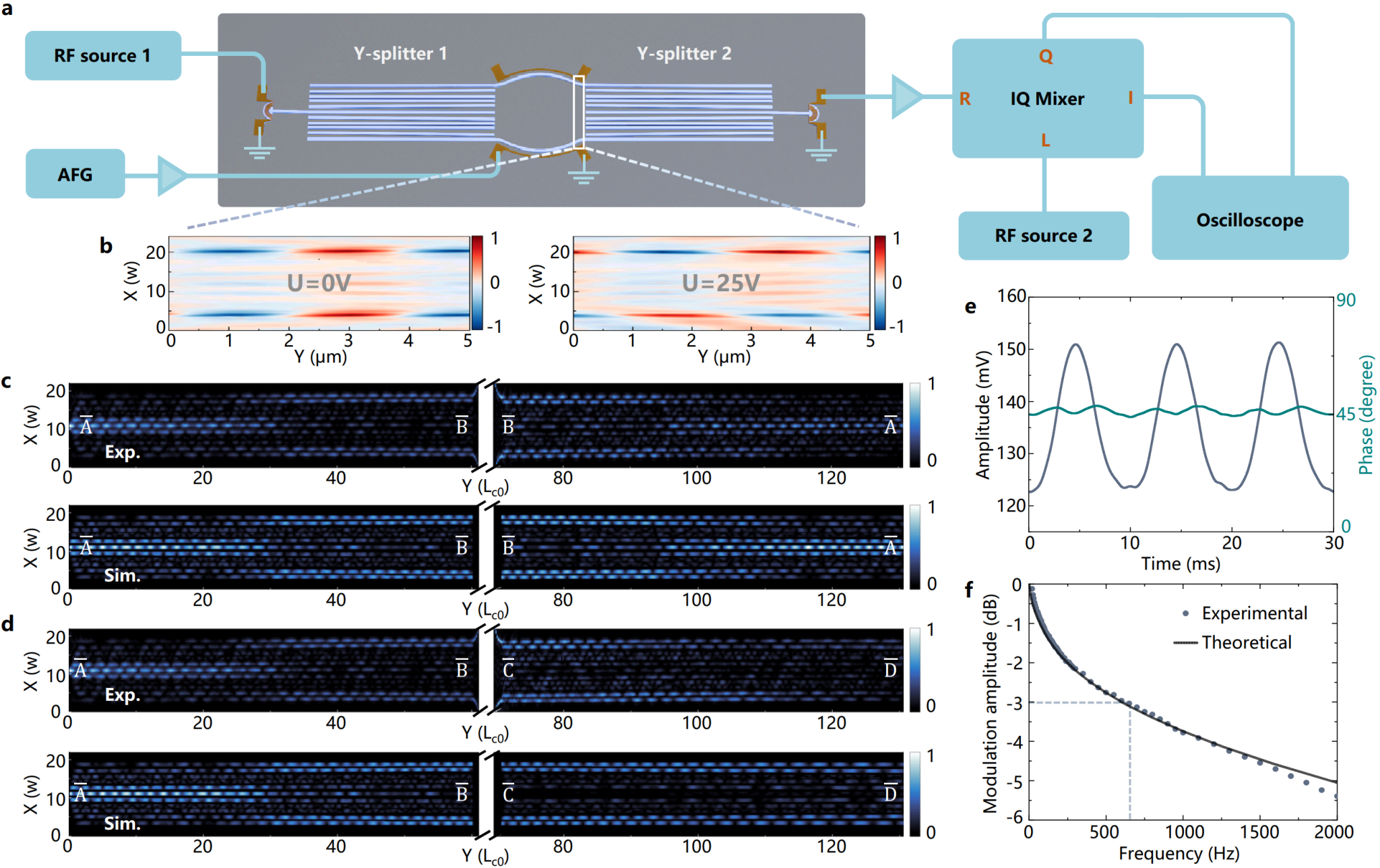 基于拓扑泵浦结构,研究团队进一步设计并实现了拓扑Y分束器和可重构拓扑声子线路(图2)。利用热声效应原理,仅需25V电压即可在干涉仪两臂间引入π相位差,实现对拓扑声子传输路径的快速电控切换。通过施加高速射频信号,器件还可以实现对声波的强度调制,3 dB调制带宽达650 Hz。为未来开发基于规模化拓扑声子线路的信息处理应用奠定了坚实基础。