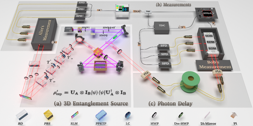 图1.实验装置图,包含三维纠缠光源、FPGA-EOM 快速切换与50m光纤短时延存储等关键部件。