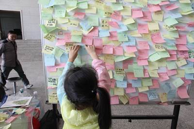 大厅门口的心愿墙是本次活动的亮点之一,也是志愿者与参观者互动的一个窗口。参观结束后,大家纷纷在“心愿墙”上留言,有不少学生将考入中国科学技术大学、成为科学家作为理想写在了心愿墙上。