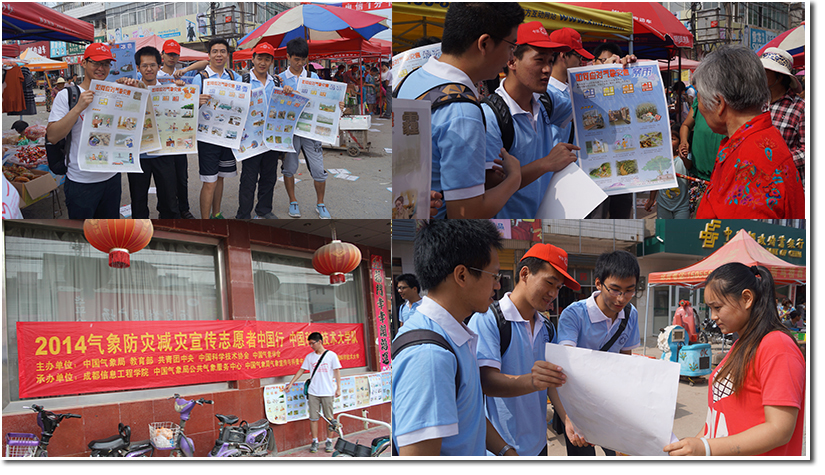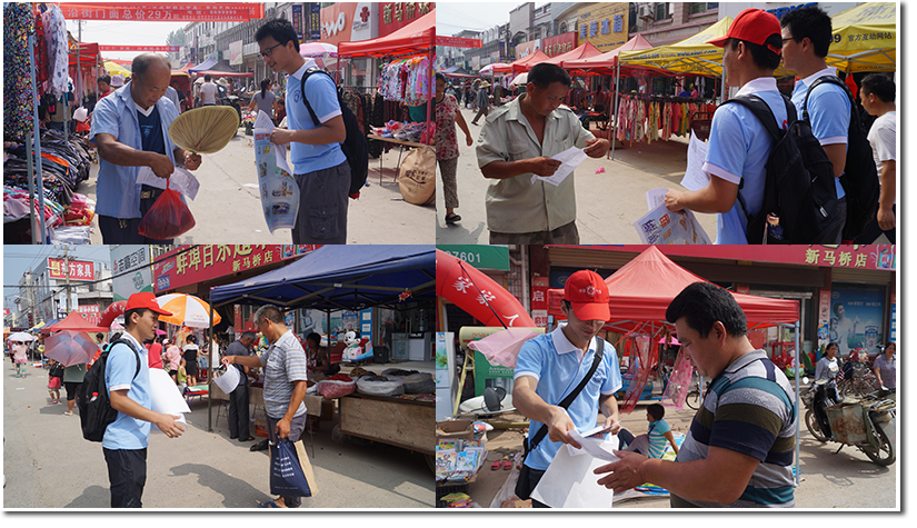 这天正是新马桥镇的逢集日,镇上赶集的乡亲很多,团员们费尽周折才找到一处合适的活动“风水宝地”。经过一番忙碌,实践团的团员们在新马桥镇的集市上开始了气象防震减灾的宣传工作。他们把横幅和海报悬挂在集市中心,很快乡亲们围上来观看,咨询在场的同学活动的具体内容。同时,一些实践团的团员拿着印制好的传单和海报走上街头,向当地赶集的人们介绍一些灾情并向他们宣传减灾的具体措施。