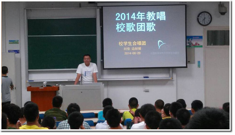 8月18日下午国科大生合唱团分别在东区礼堂西区礼堂全体新生教唱校歌团歌,教唱者分别是董梦皓(校学生合唱团现任团长)左训午同学在之几天中,生合唱团的团员们将走进班级,进行逐班教唱