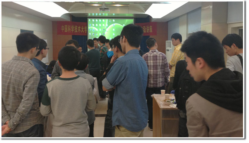 在两位老师演讲结束之后,科大IEEE俱乐部向两位老师赠送了纪念奖杯。之后的冷餐会环节中,同学们开始与老师们零距离交流。大家的问题从生活学习细节到科研生涯规划,无所不有。同学们在品尝冷餐会糕点美食的同时,也在享受着精神学术的大餐。