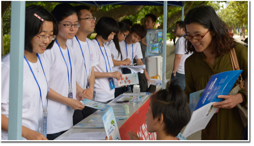 在活动现场青年志愿者们时刻秉承微笑服务的精神,先是认真地布置活动现场,共同探讨服务细节,完善各个服务细节,然后满怀期待地等待着各个学校参观者的到来。