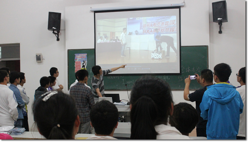 机器人演示完后,王欣睿上台给同学们介绍自己做机器人的经历,通过视频给同学们展示机器人是如何一步一步制作出来的。他细致地讲解了自己制作的机器人,让同学们对于“如何制作机器人”这个问题有了一个初步的了解。他展示着自己的机器人比赛时的视频,同学们表现出钦佩之情。