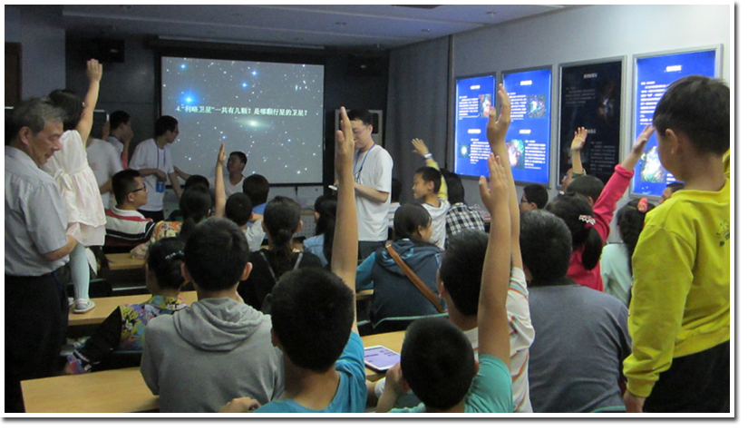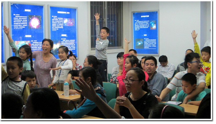18日晚,进行了“天文知识有奖竞猜”活动。活动中由主持人同学提出一些科普类的问题,小朋友们进行竞猜,回答正确的小朋友将能得到精美奖品以资鼓励。可以看到,现场气氛异常热烈,小朋友们踊跃回答问题。这一方面展现出了小朋友们对天文知识的浓厚兴趣,另一方面也体现了我们国家对天文科普的少儿阶段普及工作是成功的。可以预见,我国的天文学事业必将人才辈出。