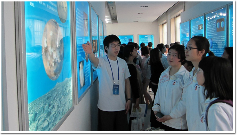 在天文系报告厅的走廊上布置了丰富的天文知识宣传栏,参观者观看的同时,也能听取工作人员对每一幅宣传栏的详细解说,学习到丰富的天文知识,切身体会到天文的乐趣。