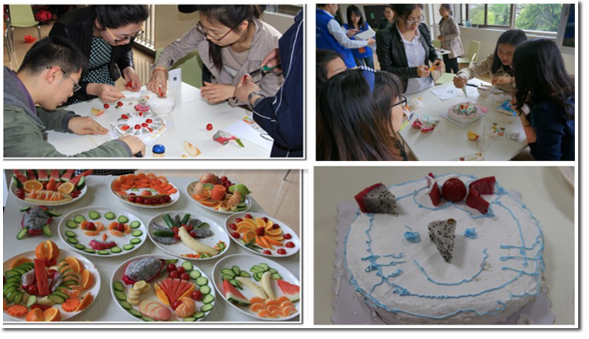 还有“蛋糕DIY”和“水果拼盘区”,选手自由组队尽情发挥想象力,利用原材料制作精美的蛋糕和别致的水果拼盘,整个活动现场十分火爆,同学们纷纷与作品合影并携带着成果满意而归。